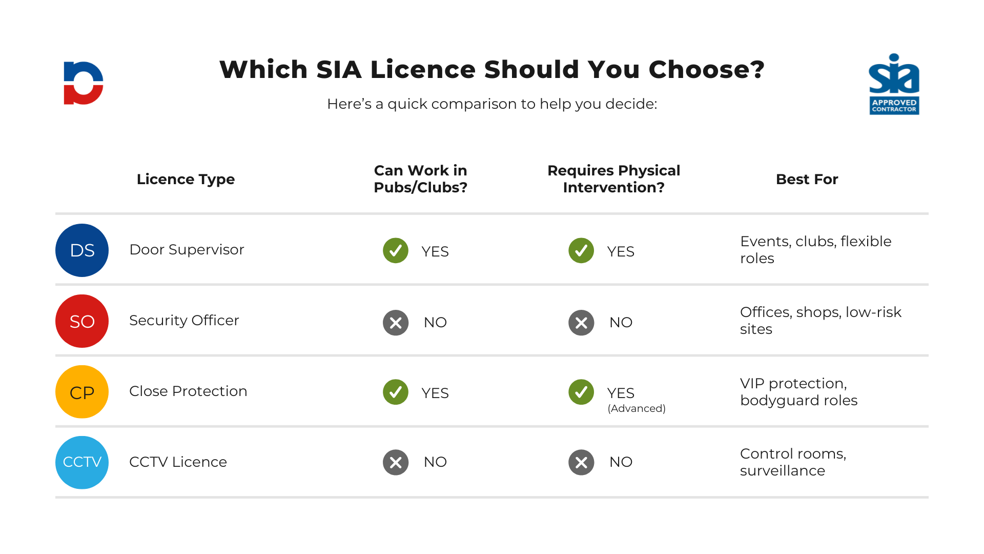 If you’re new to the industry, the Door Supervisor licence offers the most flexibility and job opportunities. Many employers prefer DS licence holders even for static guarding roles.